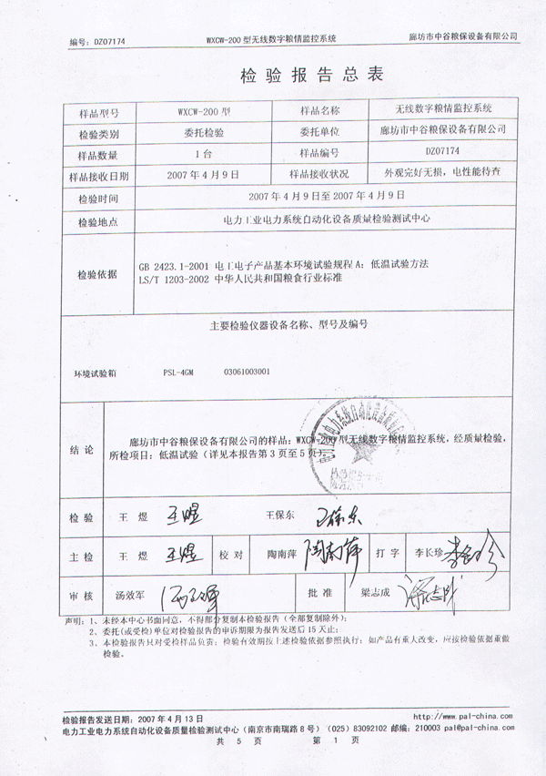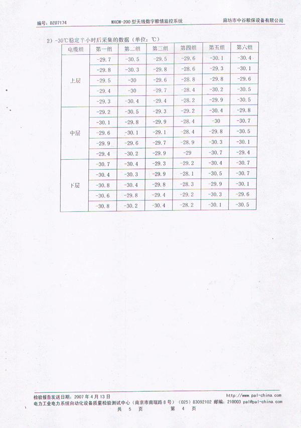 中谷糧保無(wú)線(xiàn)數字糧情監控系統檢測報告